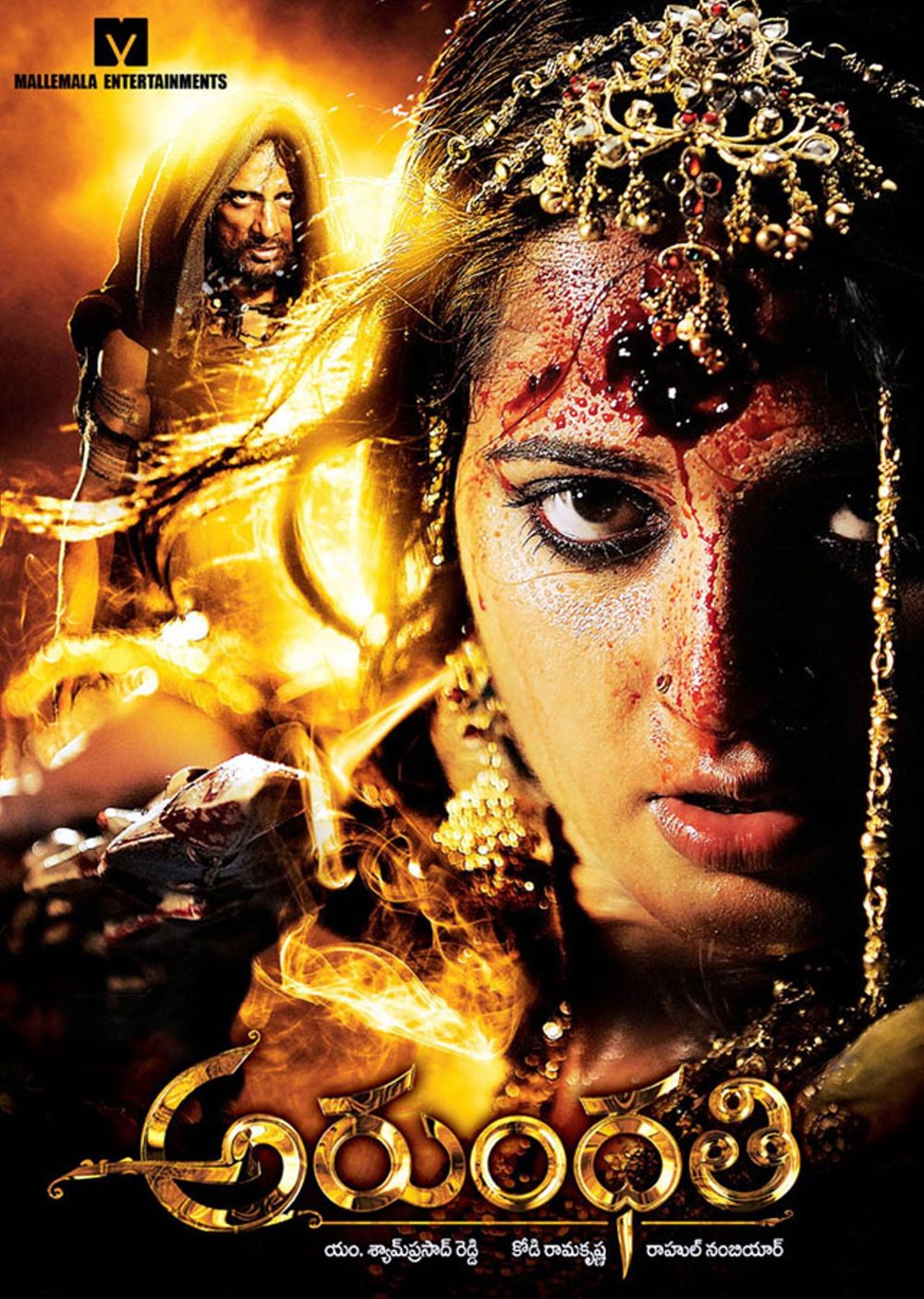 She then goes to Gadwal where her grandfather resides to visit him. Her grandfather, the head of the family, talks to her with respect as if she were older than him. She receives a misleading phone call in her fiance Rahul's (Arjan Bajwa) voice asking her to come to the fort of Gadwal, where she faces a horrible revelation. Learning the story from an aged servant maid, Chandramma (Manorama), Arundhati comes to know that she is a look alike of her great-grandmother Arundhati/Jejjamma.