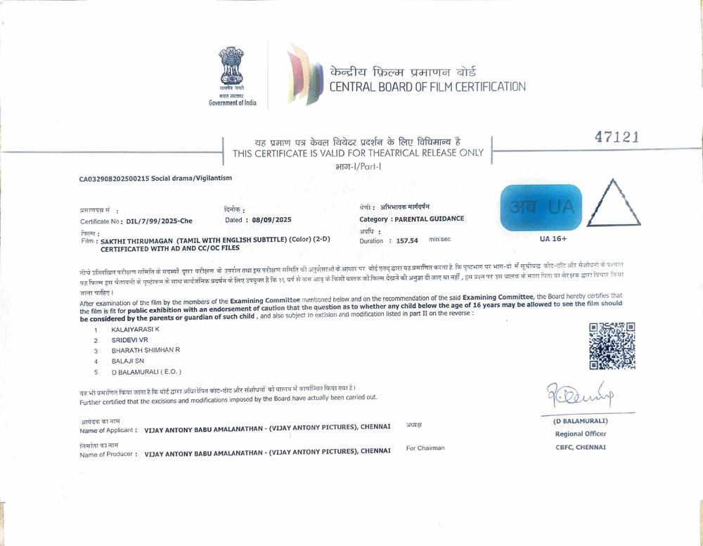 Crew: Arun Prabu Purushothaman (Director), Shelley R Calist (Director of Photography), Vijay Antony (Music Director)